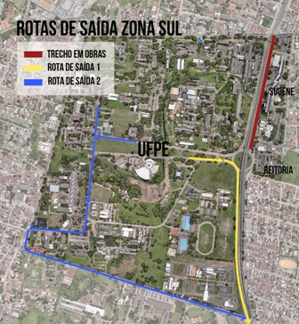 Devido à realização das obras de restauração e requalificação de trecho da BR-101 no trecho compreendido entre o Banco do Brasil e o Edifício Sudene, a UFPE, por meio da Superintendência de Infraestrutura (Sinfra), apresenta opções viárias para a comunidade acadêmica, para a população circunvizinha e para quem faz uso da BR-101 cotidianamente, visando minimizar o impacto inerente das reformas, para chegar à Universidade ou sair dela, em direção às zonas sul ou norte.
