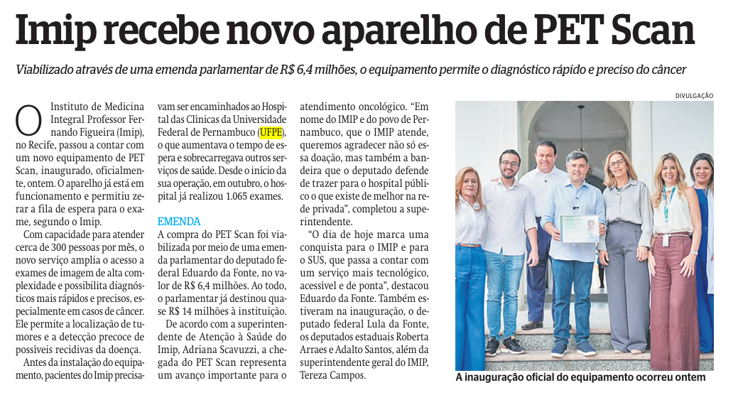 Diário de Pernambuco- Imip recebe novo aparelho de PET Scan