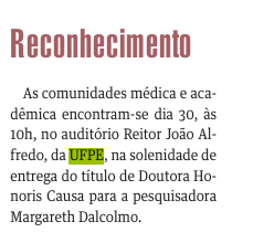 As comunidades médica e acadêmica encontram-se dia 30, às 10h, no auditório Reitor João Alfredo, da UFPE, na solenidade de entrega do título de Doutora Honoris Causa para a pesquisadora Margareth Dalcolmo.