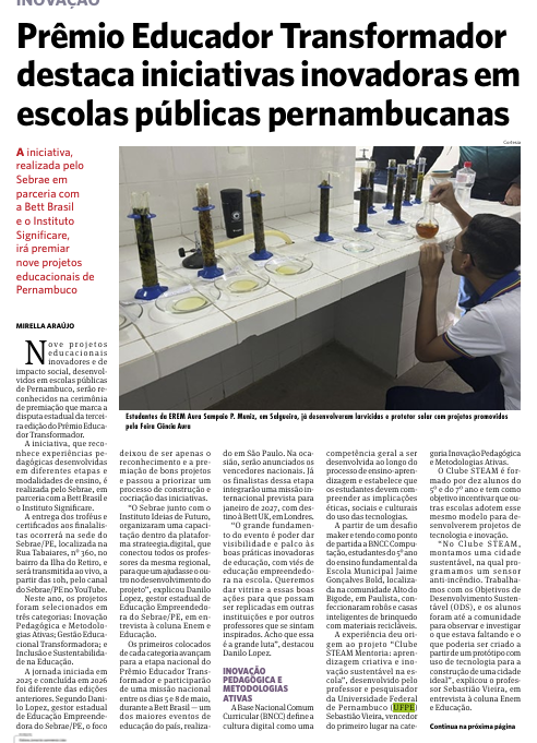 - Jornal do Commercio- Prêmio Educador Transformador destaca iniciativas inovadoras em escolas públicas pernambucanas