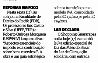 Nesta sexta(17), às 10h30, na Faculdade de Direito do Recife (FDR), Os professores Eric Castro e Silva (UFPE/FDR) e Roberto Quiroga Mosquera (USP/FGV) lançam o livro ''Aspectos essenciais do imposto e da contribuição sobre bens e serviços''. A obra é um guia estratégico sobre a transição para o modelo IVA, consolidado pela EC 132/2023 e pela LC 214/2025.