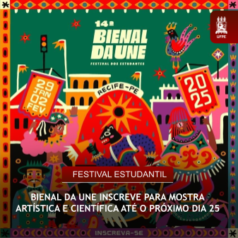 A 14ª edição da Bienal da UNE já tem data e local para acontecer. O maior festival estudantil da América Latina vai ocorrer de 29 de janeiro a 2 de fevereiro de 2025, em diversos espaços do Campus Recife da Universidade Federal de Pernambuco (UFPE). Estudantes de todo o Brasil interessados em enviar trabalhos para a mostra artística (nas áreas de artes do corpo, artes visuais, audiovisual, fotografia, literatura e música) e também para a mostra científica têm até o dia 25 deste mês para inscrever as obras. As inscrições devem ser feitas no site da bienal.