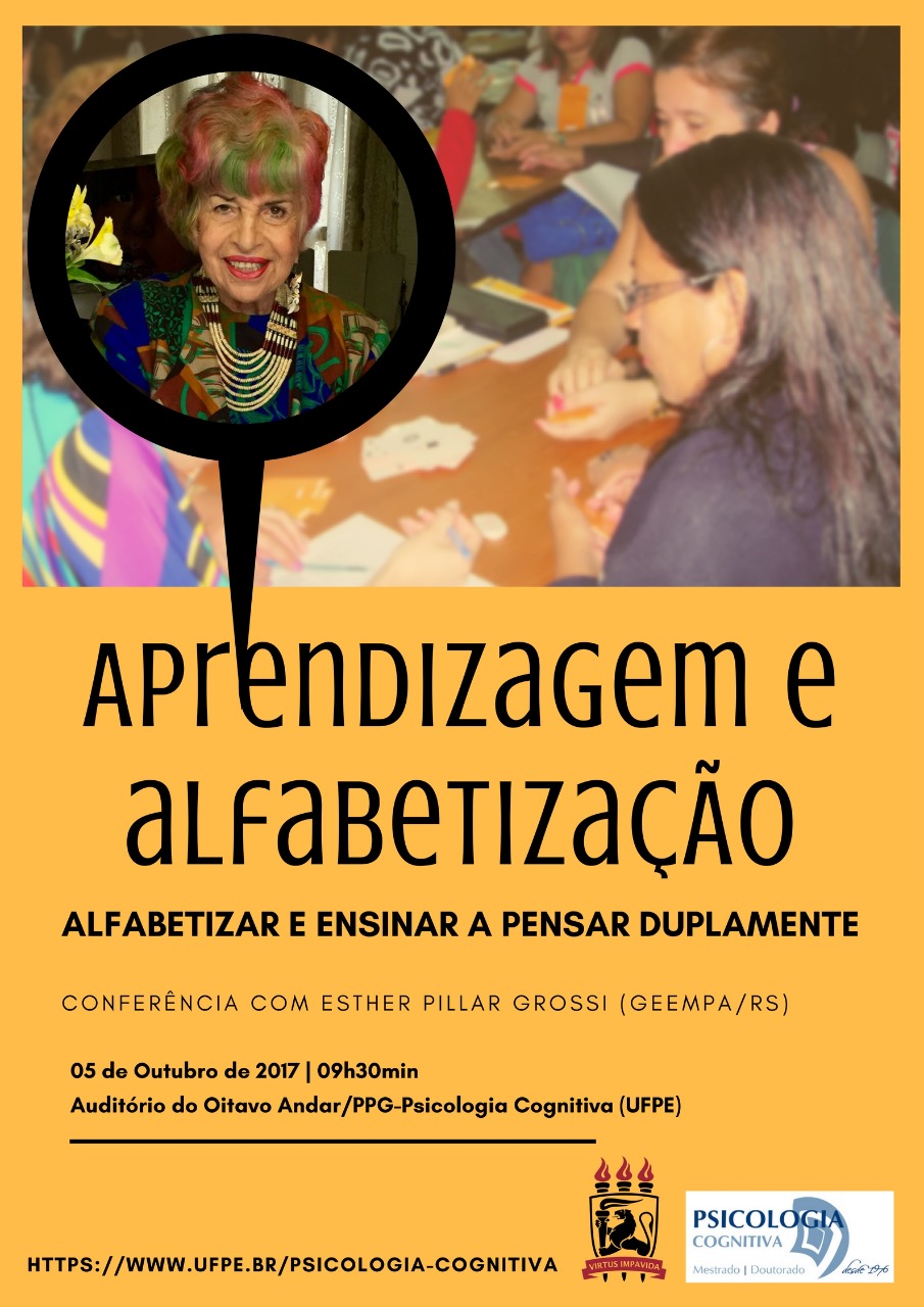 No dia 05 de Outubro de 2017, as 9h30min, a Educadora, Alfabetizadora, Professora de Matemática, Liderança Política na educação, Presidente do Grupo de Estudos sobre a Educação, a Metodologia da Pesquisa e Ação (GEEMPA, RS)  e Doutora em Psicologia Cognitiva (realizado na Universidade la Sorbonne em Paris, sob a orientação do Prof. Gérard Vergnaud), Esther Pillar Grossi ministrará uma palestra no Auditório do Programa de Pós-graduação de Psicologia Cognitiva na UFPE. Com o tema "Aprendizagem e Alfabetização: Alfabetizar é ensinar a pensar duplamente ", a educadora apresentará os pressupostos de sua proposta pedagógica, fundada na teoria pós-construtivista, que leva em conta a dimensão social nos fenômenos da aprendizagem. No dia anterior, 4 de outubro as 9h30, ela apresentara uma palestra sobre o tema: "a Matemática a serviço do pensamento".