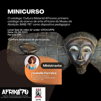 A ministrante, Isabelle Ferreira, é produtora cultural, historiadora graduada na UFPE e mestranda em Cultura e Territorialidades pela Universidade Federal Fluminense (UFF). Será abordada no curso a possibilidade da utilização do acervo de arte africana do Museu da Abolição (MAB) para auxiliar o ensino da história africana em escolas. O catálogo está disponível a partir deste link.