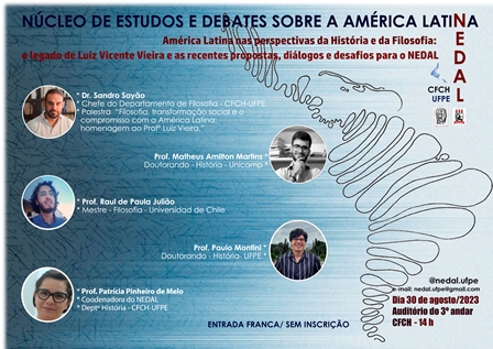 O Núcleo de Estudos e Debates sobre a América Latina (Nedal) da UFPE promove, na quarta-feira (30), às 14 h, o evento “América Latina nas perspectivas da História e da Filosofia: o legado de Luiz Vicente Vieira e as recentes propostas, diálogos e desafios para o Nedal”. O encontro é aberto ao público e ocorre no auditório do 3º andar do Centro de Filosofia e Ciências Humanas (CFCH) da Universidade.