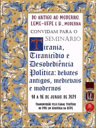 Da segunda (14) a quarta-feira (16), o Programa de Pós-Graduação em História (PPGHistória) da UFPE promoverá 1º seminário virtual de estudos que abordam temáticas associadas à Antiguidade, ao Medievo e ao Mundo Moderno. Com título de “Tirania, Tiranicídio e Desobediência Política: debates antigos, medievais e modernos”, o evento abordará a figura histórica do tirano, bem como as diversas maneiras com as quais as sociedades que lidaram com a tirania reagiram à sua existência e planejaram e/ou promoveram sua remoção, desde a Idade Antiga à Moderna.