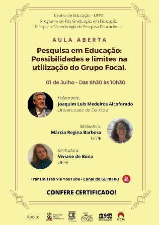 O evento on-line contará com a presença do professor Joaquim Luís Medeiros Alcoforado, da Faculdade de Psicologia e Ciências da Educação da Universidade de Coimbra, que abordará a temática: “Pesquisa em Educação: Possibilidades e limites na utilização do Grupo Focal”. O evento será transmitido em formato de live no canal do Gepifhri no YouTube.