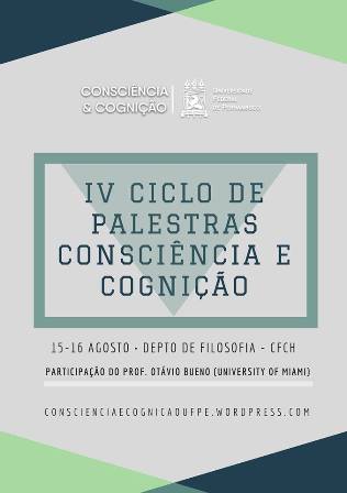 O IV Ciclo de Palestras Consciência e Cognição será realizado nos dias 15 e 16 de agosto, no auditório do Departamento de Filosofia, localizado no 15° andar do Centro de Filosofia e Ciências Humanas (CFCH) da Universidade Federal de Pernambuco (UFPE). O evento abarca temas em Filosofia Analítica em geral, com palestras de professores e aberto para comunicações de estudantes.