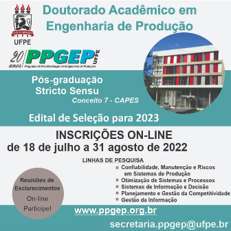 O Programa de Pós-Graduação em Engenharia de Produção (PPGEP) divulga o edital para ingresso de alunos de mestrado e doutorado ano letivo 2023, no Boletim Oficial da UFPE e através do site da Pró-Reitoria de Pós-Graduação