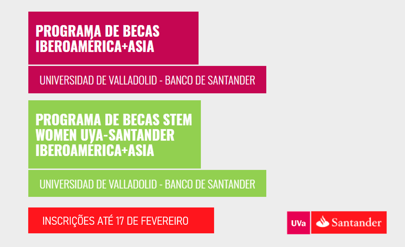 Estão abertas até 17 de fevereiro as inscrições para os Programas de bolsas de Mestrado desenvolvidos em parceria entre o Banco Santander e a Universidad de Valladolid (UVa) para o ano acadêmico de 2022/2023.