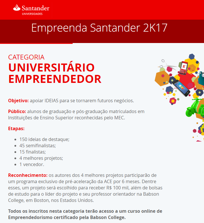 Na categoria Universitários podem participar alunos de graduação e pós-graduação matriculados em Instituições de Ensino Superior reconhecidas pelo MEC. Os autores dos 4 melhores projetos participarão de um programa exclusivo de pré-aceleração da ACE, Aceleradora de Startups da América Latina, por 6 meses. Dentre esses, um projeto será escolhido para receber R$ 100 mil, além de bolsas de estudo para o líder do projeto e seu professor orientador na Babson College, em Boston, nos Estados Unidos. Todos os inscritos na categoria terão ainda acesso a um curso online de Empreendedorismo certificado pela Babson College.