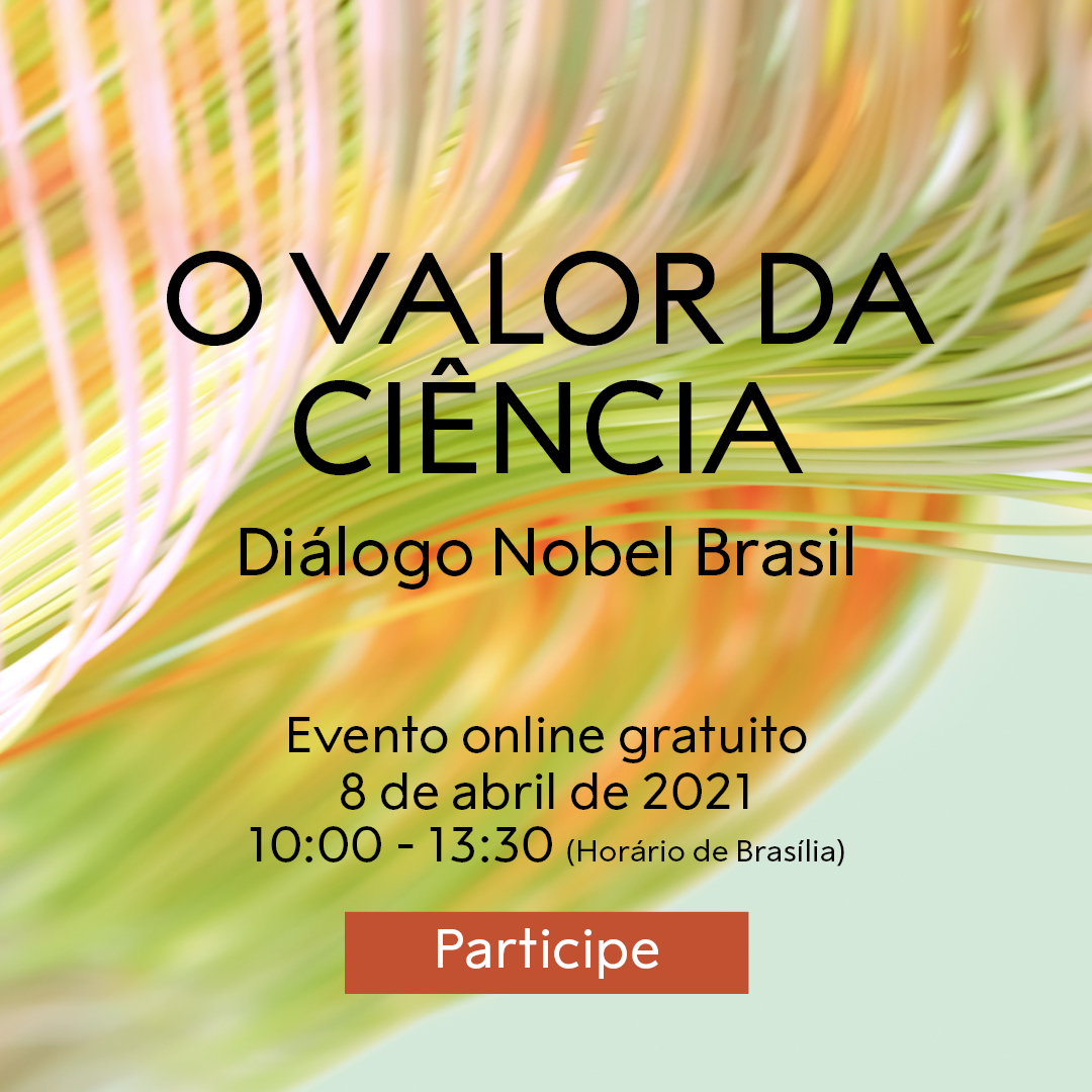 A Nobel Prize Outreach e a Acadêmia Brasileira de Ciências (ABC) realizam amanhã (8), das 10h às 13h30, o "Diálogo Nobel Brasil", com o tema “o valor da ciência”. A discussão entre quatro proeminentes cientistas debaterá como a ciência e os cientistas podem contribuir para a sociedade e como, por sua vez, a sociedade pode contribuir para a ciência. O evento pode ser acompanhado gratuitamente através do youtube do Nobel Prize: https://www.youtube.com/watch?v=ffmcJedP6Yg