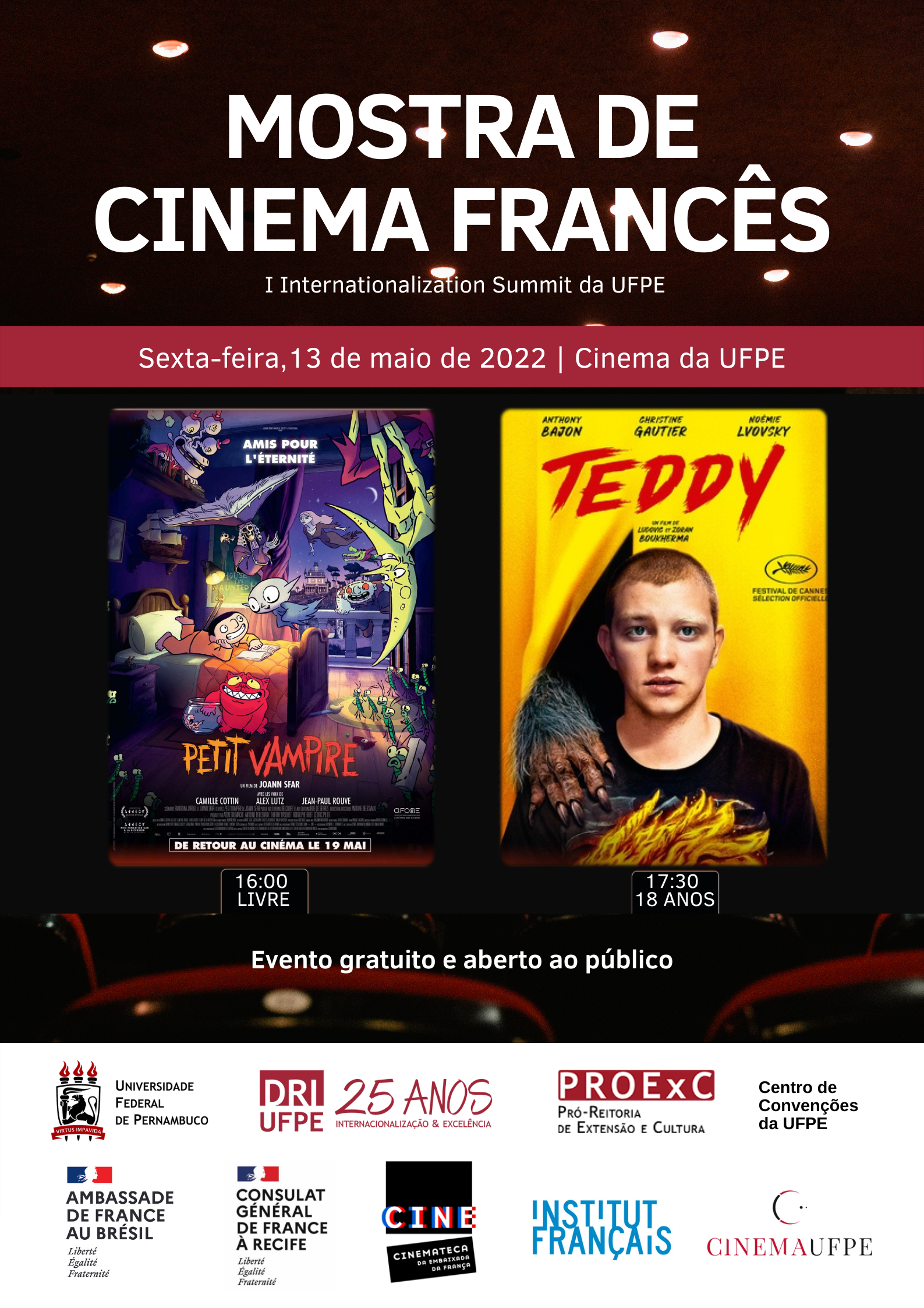 O Cinema da UFPE realiza nesta sexta (13), a partir das 16h, uma mostra de filmes franceses, em desdobramento do I Internationalization Summit da UFPE. Serão exibidos a animação Petit Vampire e o filme de terror Teddy. A mostra é gratuita e não é necessário realizar inscrição prévia, apenas comparecer ao cinema no horário da exibição. A iniciativa é fruto de uma parceria da Diretoria de Relações Internacionais com o Consulado da França, o Instituto Francês, o Centro de Convenções da UFPE e a Pró-reitoria de Extensão e Cultura (Proexc).