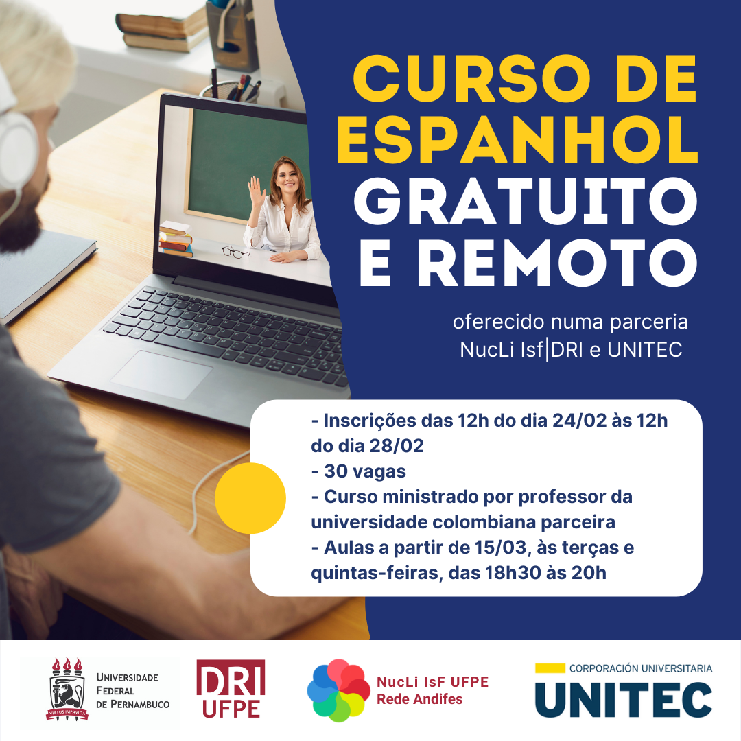O Núcleo de Línguas – Idiomas sem Fronteiras (NucLi) da UFPE recebe inscrições para um curso de espanhol ofertado em parceria com a Coorporación Universitária Unitec. O curso, ministrado por parceiro da universidade colombiana, está voltado a estudantes de nível iniciante (A1) e terá carga horária total de 48 horas (24 horas de aulas síncronas e 24 de aulas assíncronas). As aulas serão realizadas às terças e quintas-feiras, das 18:30 às 20:00, a partir do dia 15 de março. As inscrições podem ser realizadas das 12h da próxima quinta (24) até às 12h do dia 28 de fevereiro neste link. Estão disponíveis 30 vagas.