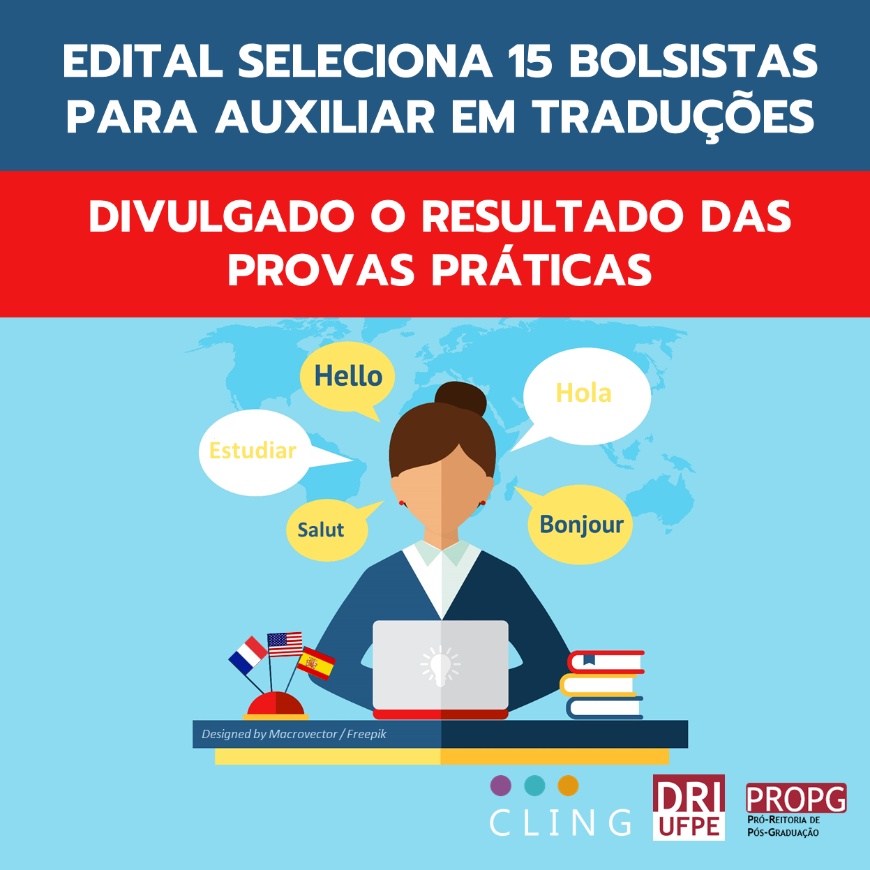 A Coordenação de Línguas e Interculturalidade (CLING), unidade da Diretoria de Relações Internacionais (DRI) da Universidade Federal de Pernambuco, divulga o resultado preliminar do edital para seleção de 15 (quinze) bolsistas de graduação do curso de Letras para apoio às atividades relativas à tradução, realizado em parceria com a Pró-Reitoria de Pós-Graduação (PROPG). No documento disponível aqui, é possível conferir o resultado da prova prática.