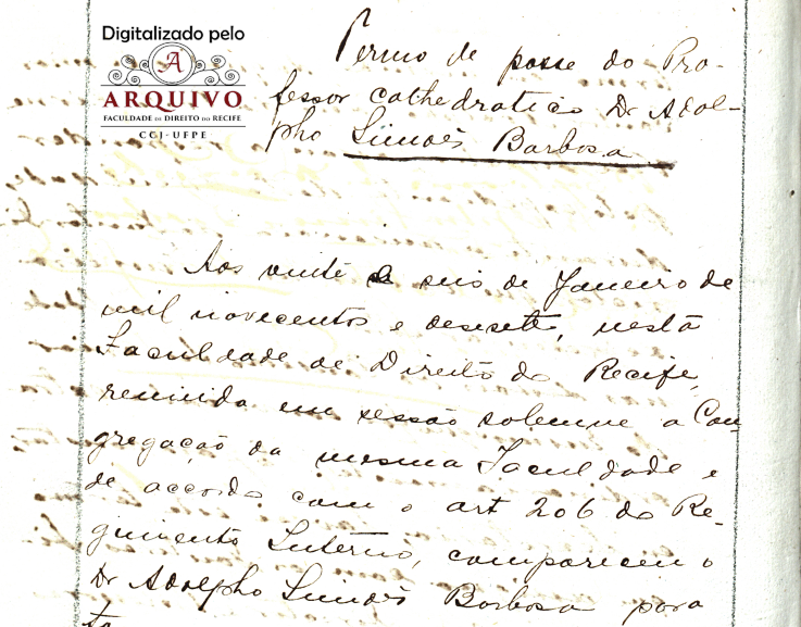 Em 26 de janeiro de 1917, nesta faculdade de Direito do Recife, reunido em sessão solene a Congregação da mesma faculdade e de acordo com o art. 206 de Regime Interno, compareceu o Dr. Adolpho Simões Barbosa para tomar posse do lugar de professor Catedrático da cadeira de Medicina Pública, para o qual foi nomeado por Decreto de 10 de janeiro de 1917.