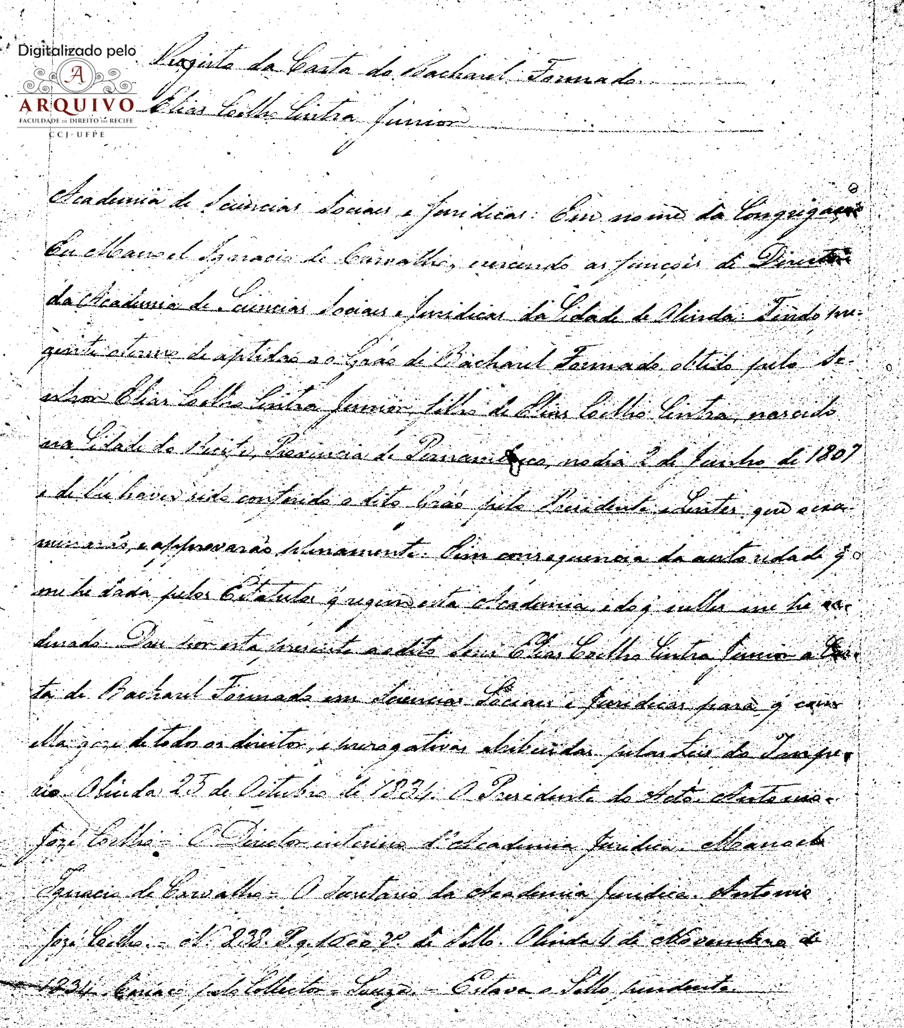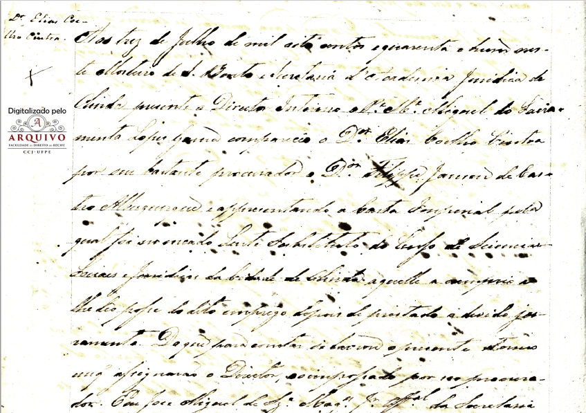 Aos 03 de julho de 1841 neste Mosteiro de São Bento e Secretaria de Academia Jurídica de Olinda, presente o Diretor interino Miguel do Sacramento Lopes Gama, compareceu o Dr. Elias Coelho Cintra por seu bastante procurador Dr. Filippe Jansen de Castro Albuquerque e apresentando a carta Imperial pela qual foi nomeado Lente Substituto do Curso de Ciência Sociais e Jurídica da Cidade de Olinda.