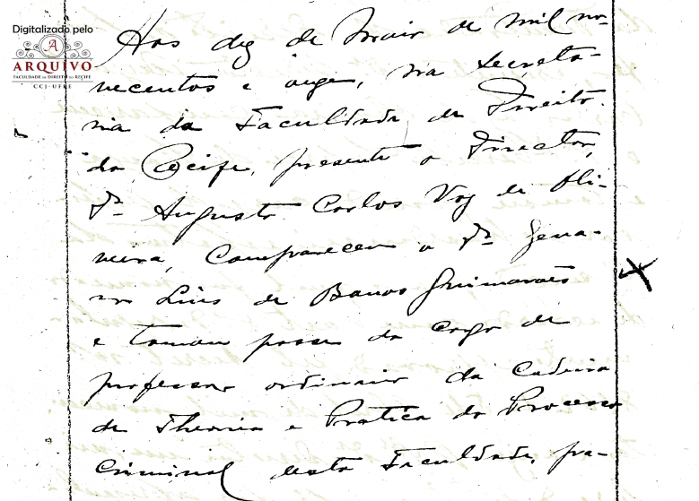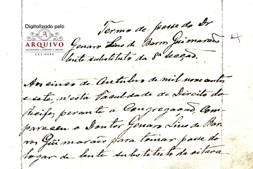 Aos 17 de Setembro de 1907, nesta Faculdade de Direito do Recife, perante a Congregação, compareceu para tomar posse do lugar de lente substituto da 5ª secção - Decreto de 25 de julho de 1807 e tomou posse em 05 de outubro de 1907.