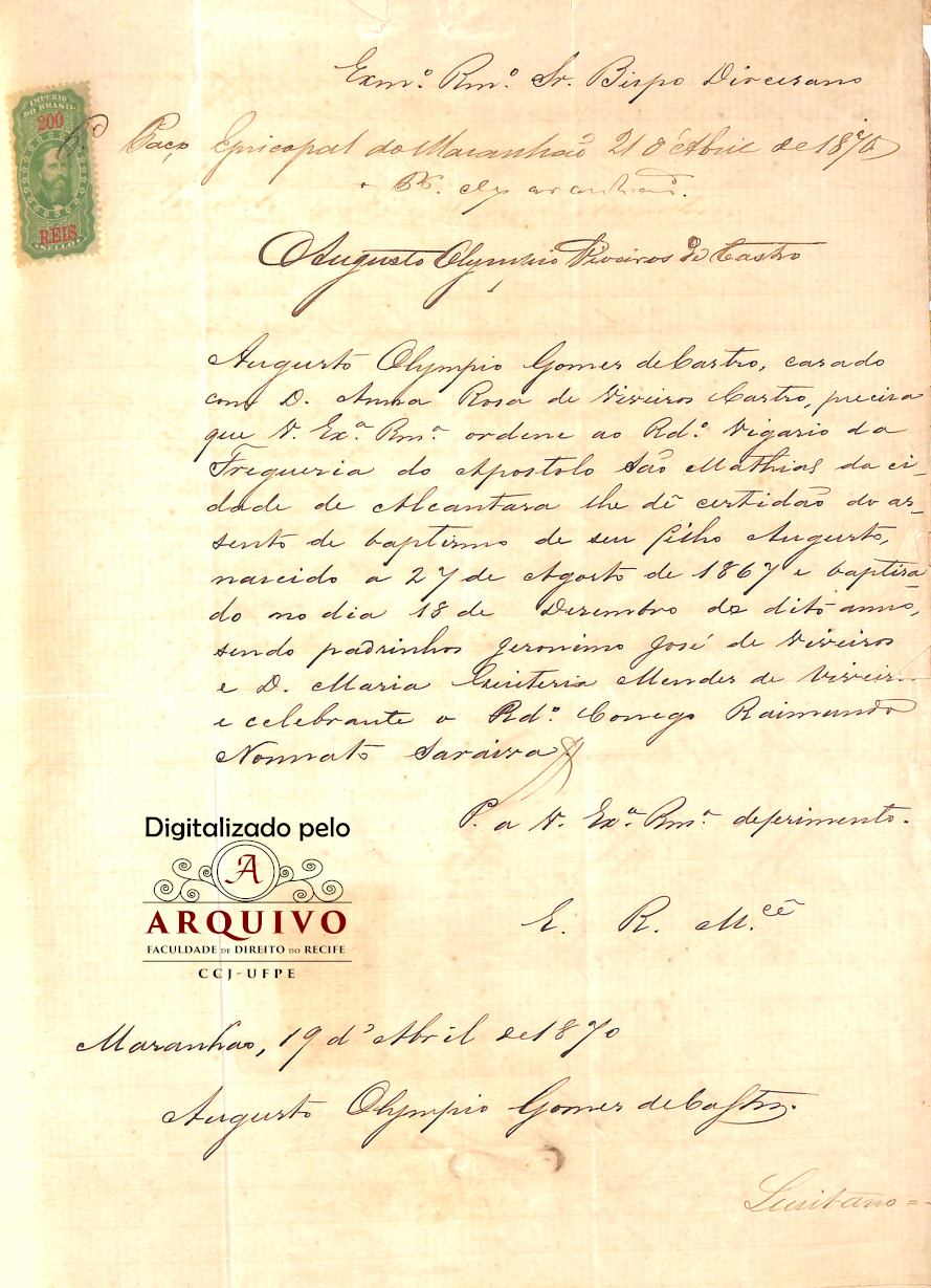 De acordo com a certidão de idade de 1884 do aluno Augusto Olympio Viveiros de Castro, consta: Certifico que, em virtude do despacho retro, revendo o livro de assento de batismo, desta freguesia, nele a folha 31, achei o assento pedido, cunho teor é o seguinte: Aos 18 de dezembro de 1867, batizei solenemente e ungi com os santos – óleos o inocente Augusto, nascido a 27 de agosto de 1867, filho legítimo do Doutor Augusto Olympio Gomes de Castro e Dona Anna Rosa de Viveiros Castro, neto paterno do Tenente Januário Daniel gomes de Castro e Dona Ana Francisca Alves Castro e materno do Barão de São Bento (Francisco Mariano de Viveiros Sobrinho) e a Baronesa de São Bento(Mariana Francisca Correia de Sousa). Foram padrinhos Jeronimo José de Viveiros e Dona Maria Quitéria Mendes de Viveiros. Assinado Cônego Raimundo Normati Saraiva - Vigario Collado.