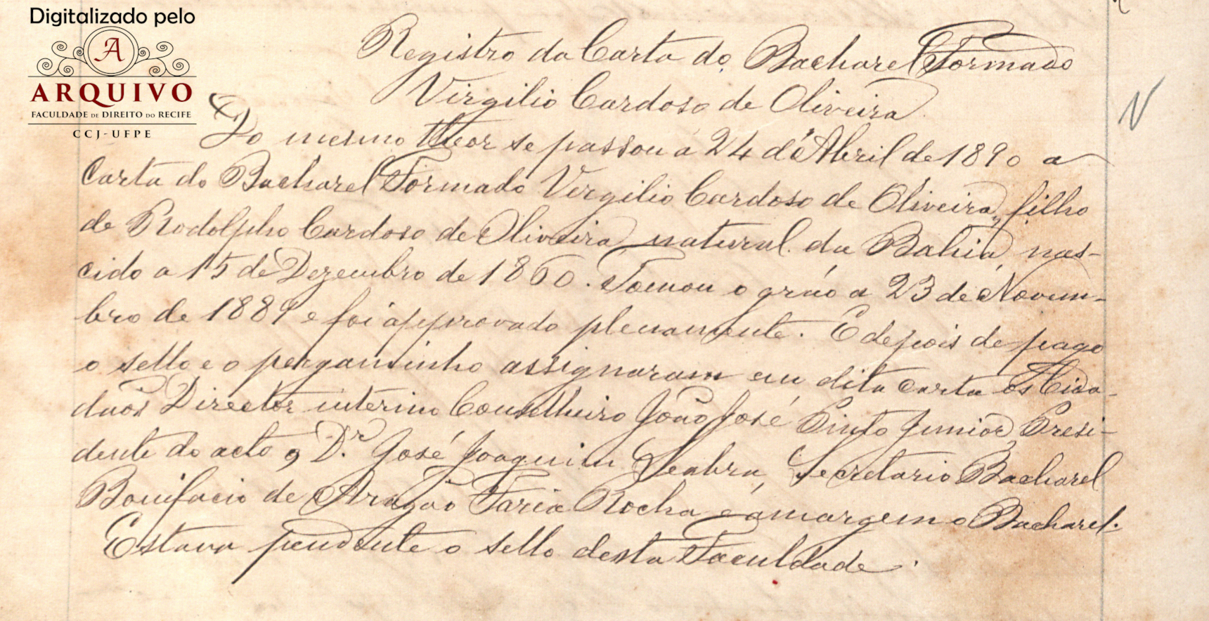 Conforme consta na certidão de idade/Batismo do aluno Virgílio Cardoso de Oliveira, nascido no dia 15 de dezembro de 1868, filho de Rodolfo Cardoso de Oliveira e Maria Virgínia de Mattos Cardoso. Foi Batizado, no dia 10 de fevereiro de 1870, na matriz de Nossa Senhora da Vitória - Bahia - pelo vigário cônego José Felix Pereira de Araújo e foram padrinhos Tito Alexandre Cardoso de Mello e Amâncio João Cardoso de Andrade.