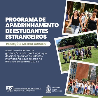 A Diretoria de Relações Internacionais (DRI) da UFPE recebe, até o dia 10 deste mês, as inscrições para a edição 2023.2 do Programa de Apadrinhamento de Estudantes Estrangeiros. O interessado deve ser aluno regularmente matriculado em um dos cursos de graduação ou de pós-graduação da UFPE, ser comunicativo, proativo e ter disponibilidade para auxiliar o aluno estrangeiro quando necessário. A iniciativa tem o objetivo de auxiliar os estudantes que estão chegando à Universidade e, ao mesmo tempo, proporcionar aos alunos a oportunidade de enriquecer culturalmente, ampliar sua rede de contatos e fazer novas amizades.