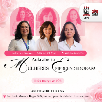 O Programa de Pós-Graduação em Administração (Propad) da Universidade Federal de Pernambuco (UFPE) realiza, no dia 16 de março, às 10h, no Anfiteatro do Centro de Ciências Sociais Aplicadas (CCSA), uma aula aberta dedicada às mulheres empreendedoras. A atividade, alusiva ao Dia Internacional da Mulher, tem como objetivo promover reflexões sobre liderança feminina, inovação, impacto social e desenvolvimento humano, destacando a contribuição das mulheres em diferentes áreas do conhecimento e no empreendedorismo. A atividade é aberta à comunidade acadêmica e ao público interessado no tema.