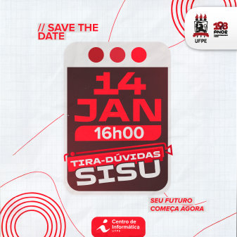 O Centro de Informática (CIn) da UFPE vai realizar uma nova edição da Live Tira-Dúvidas, que busca responder perguntas sobre os cursos de graduação em Ciência da Computação, Engenharia da Computação, Sistemas da Informação e Inteligência Artificial oferecidos pelo Centro. O evento on-line e ao vivo é direcionado a interessados em ingressar na instituição por meio do Sistema de Seleção Unificada (Sisu). A transmissão ocorre nesta quarta-feira (14), às 16h, a partir do canal oficial do CIn no YouTube e do perfil do Centro no Instagram.