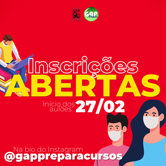 Estão abertas as inscrições para ingressar na turma 2021 do curso pré-Enem Grupo de Preparatório (GAP). O GAP oferece de forma gratuita acesso às aulas no YouTube, como também os aulões ao vivo dos sábados e aulas gravadas durante a semana, e ainda a possibilidade de fazer parte do grupo do projeto no WhatsApp. Os interessados devem fazer sua inscrição através do preenchimento de formulário on-line. Após o preenchimento o estudante recebe, no próprio formulário, o link para o grupo de whatsapp do projeto.