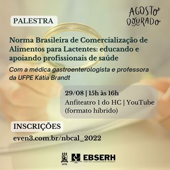 O Banco de Leite Humano (BLH) do Hospital das Clínicas da UFPE promove a palestra “Norma Brasileira de Comercialização de Alimentos para Lactentes: educando e apoiando profissionais de saúde”, com a médica gastroenterologista e professora da UFPE Kátia Brandt, no dia 29 deste mês, das 15h às 16h, em formato híbrido – presencial no Anfiteatro 1 do HC e on-line pelo YouTube. As inscrições já estão abertas neste site. O evento integra as ações do Agosto Dourado no HC, que é uma unidade vinculada à Empresa Brasileira de Serviços Hospitalares (Ebserh).
