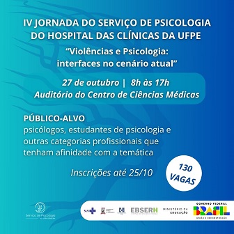 As inscrições para a IV Jornada do Serviço de Psicologia do Hospital das Clínicas da UFPE estão abertas até o dia 25 de outubro e podem ser realizadas por este formulário on-line. Com 130 vagas, evento deste ano tem como tema “Violências e Psicologia: interfaces no cenário atual” e acontecerá no dia 27 de outubro, das 8h às 17h, no auditório do Centro de Ciências Médicas (CCM) da UFPE. A coordenação é da chefe do Serviço de Psicologia do HC, Jéssica Sampaio, e tem os membros de sua equipe como organizadores. O HC é uma unidade vinculada à Empresa Brasileira de Serviços Hospitalares (Ebserh).