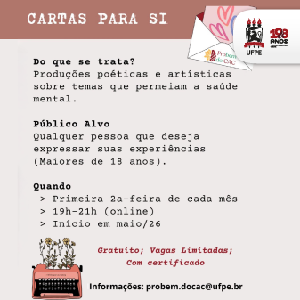 O projeto de extensão ProBem do CAC está com inscrições abertas para a ação “Cartas para si”, voltada para a produção de textos e expressões artísticas sobre saúde mental. A iniciativa é destinada a pessoas com 18 anos ou mais interessadas em compartilhar experiências por meio da escrita e da arte. A participação é gratuita, com emissão de certificado. As vagas são limitadas a 20 participantes. As inscrições devem ser feitas até o dia 25 de abril, por meio de formulário on-line.