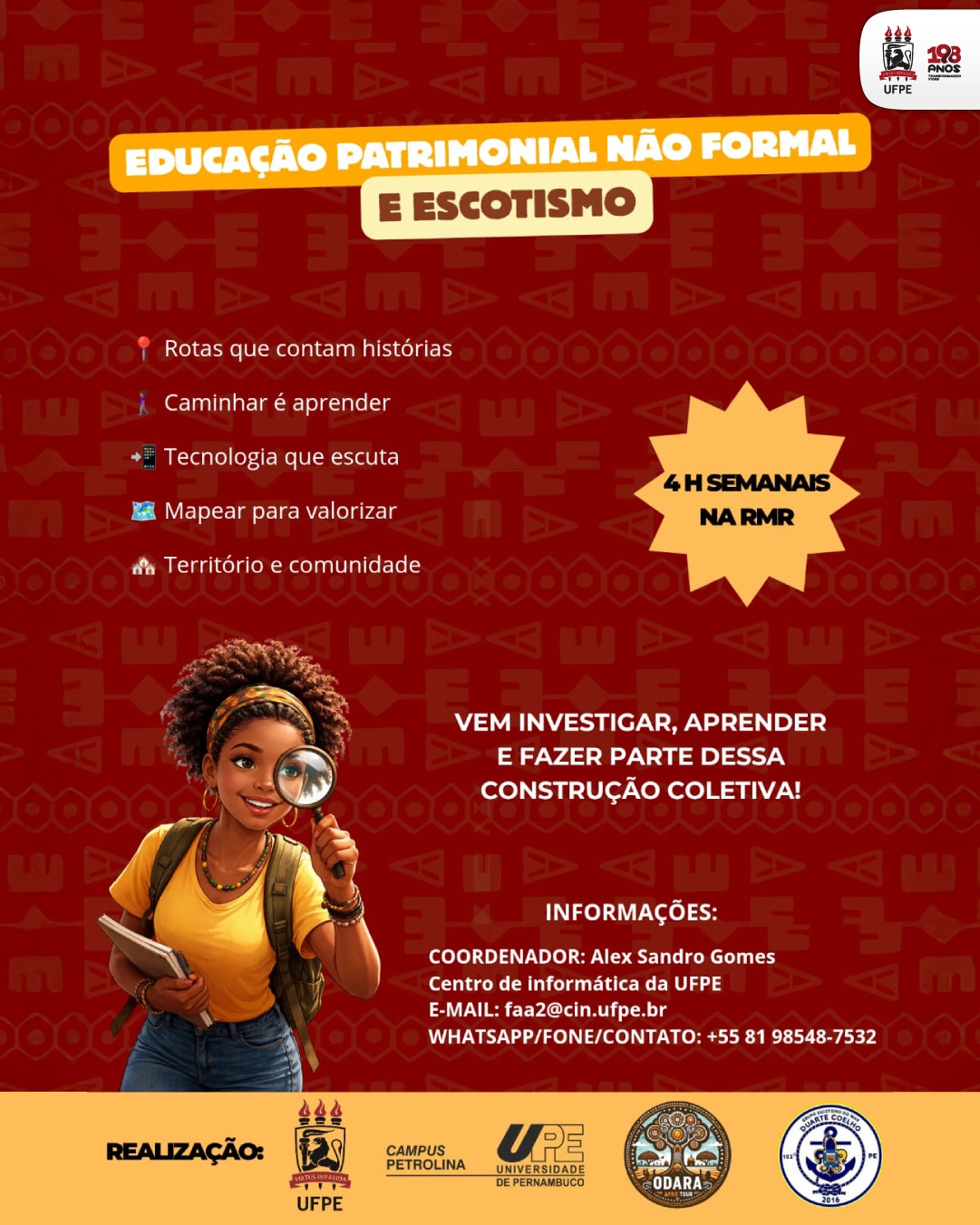Estão abertas as inscrições para o projeto de extensão “Educação patrimonial, turismo e escotismo”, iniciativa que envolve discentes de graduação e pós-graduação da Universidade Federal de Pernambuco (UFPE) com foco na valorização de memórias e patrimônios afro-brasileiros e indígenas em contextos urbanos e rurais. Coordenado pelo professor Alex Sandro Gomes, do Centro de Informática (CIn), o projeto prevê o desenvolvimento de rotas geolocalizadas com conteúdos multimídia, além da realização de atividades educativas em parceria com grupos escoteiros.
