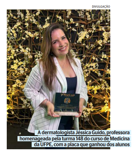 A dermatologista Jéssica Guido, professora homenageada pela turma 148 do curso de Medicina da UFPE, com a placa que ganhou dos alunos