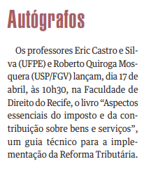 Os professores Eric Castro e Silva (UFPE) e Roberto Quiroga Mosquera (USP/FGV) lançam, dia 17 de abril, às 10h30, na Faculdade de Direito do Recife, o livro “Aspectos essenciais do imposto e da contribuição sobre bens e serviços”, um guia técnico para a implementação da Reforma Tributári