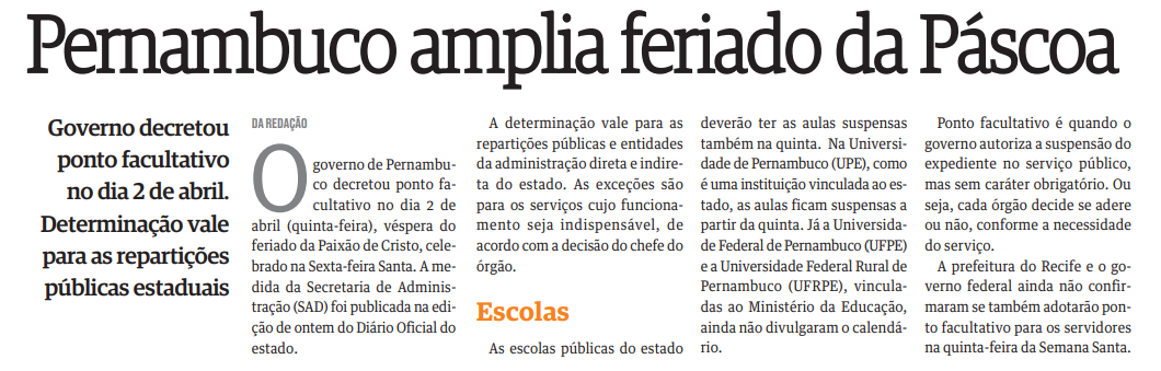 - Folha de Pernambuco - Pernambuco amplia feriado da Páscoa
