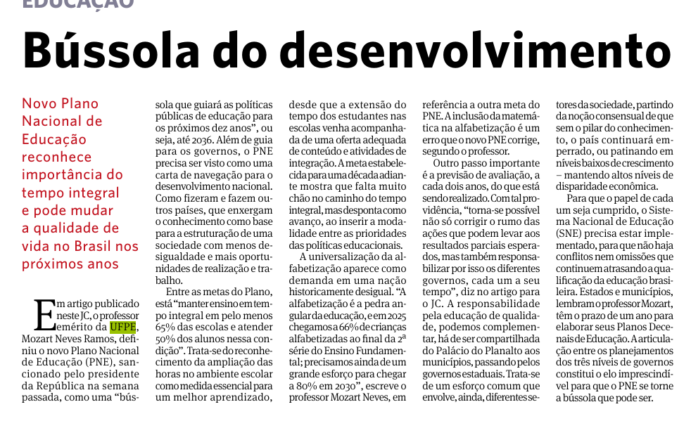 Em artigo publicado neste JC, o professor emérito da UFPE, Mozart Neves Ramos, definiu o novo Plano Nacional de Educação (PNE), sancionado pelo presidente da República na semana passada, como uma “bússola que guiará as políticas públicas de educação para os próximos dez anos”, ou seja, até 2036. Além de guia para os governos, o PNE precisa ser visto como uma carta de navegação para o desenvolvimento nacional. Como fizeram e fazem outros países, que enxergam o conhecimento como base para a estruturação de uma sociedade com menos desigualdade e mais oportunidades de realização e trabalho.