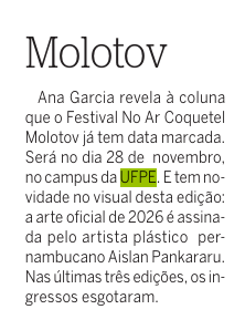 Ana Garcia revela à coluna que o Festival No Ar Coquetel Molotov já tem data marcada. Será no dia 28 de novembro, no campus da UFPE. E tem novidade no visual desta edição: a arte oficial de 2026 é assinada pelo artista plástico pernambucano Aislan Pankararu. Nas últimas três edições, os ingressos esgotaram.