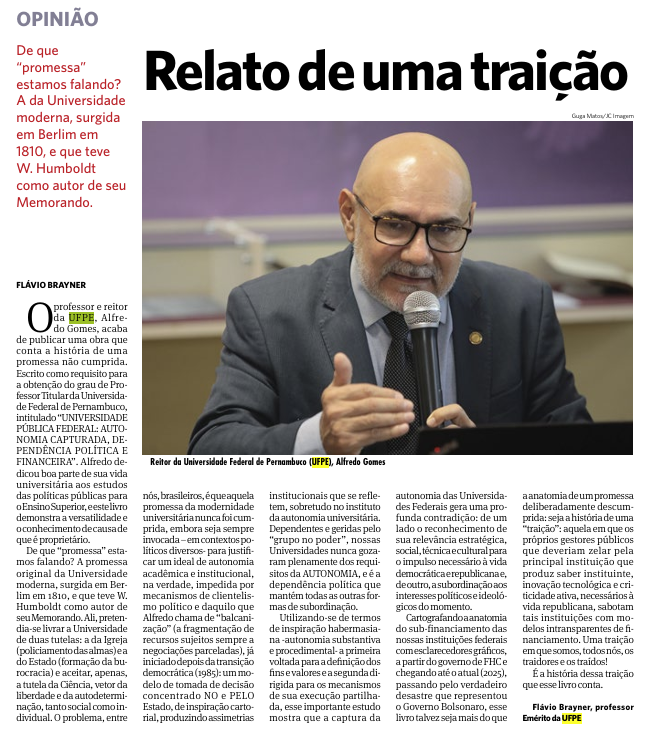 O professor e reitor da UFPE, Alfre do Gomes, acaba de publicar uma obra que conta a história de uma promessa não cumprida. Escrito como requisito para a obtenção do grau de Professor Titular da Universidade Federal de Pernambuco, intitulado “UNIVERSIDADE PÚBLICA FEDERAL: AUTO NOMIA CAPTURADA, DE PENDÊNCIA POLÍTICA E FINANCEIRA”. Alfredo dedicou boa parte de sua vida universitária aos estudos das políticas públicas para o Ensino Superior, e este livro demonstra a versatilidade e o conhecimento de causa de que é proprietário.