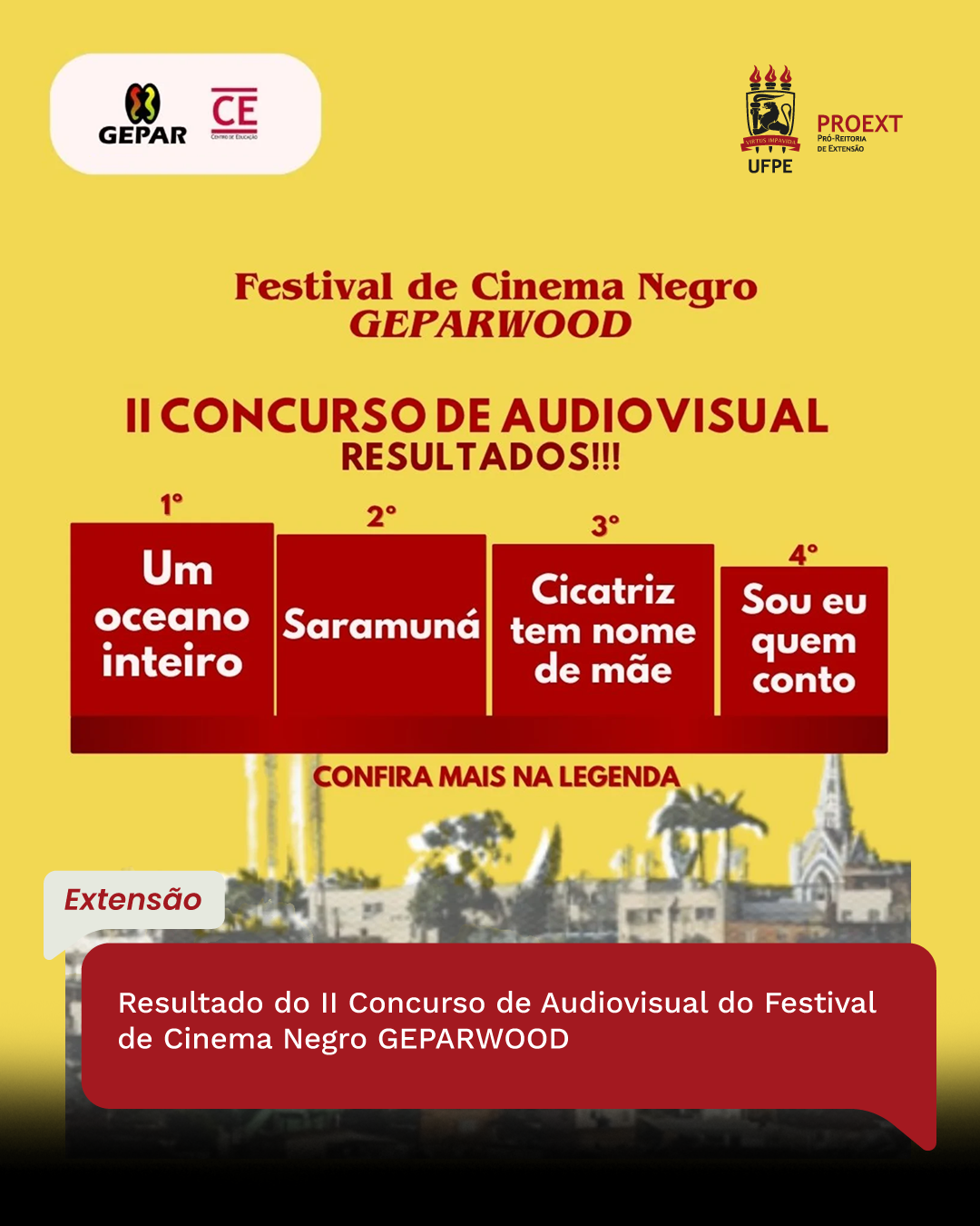 O GEPAR - Grupo de Estudos e Pesquisas em Autobiografias, Racismos e Antirracismos na Educação da UFPE tem a imensa satisfação de anunciar os vencedores do II Concurso de Audiovisual do Festival de Cinema Negro GEPARWOOD. Foram recebidas obras potentes, sensíveis e carregadas de identidade, por isso o grupo celebra os filmes que se destacaram nesta edição.