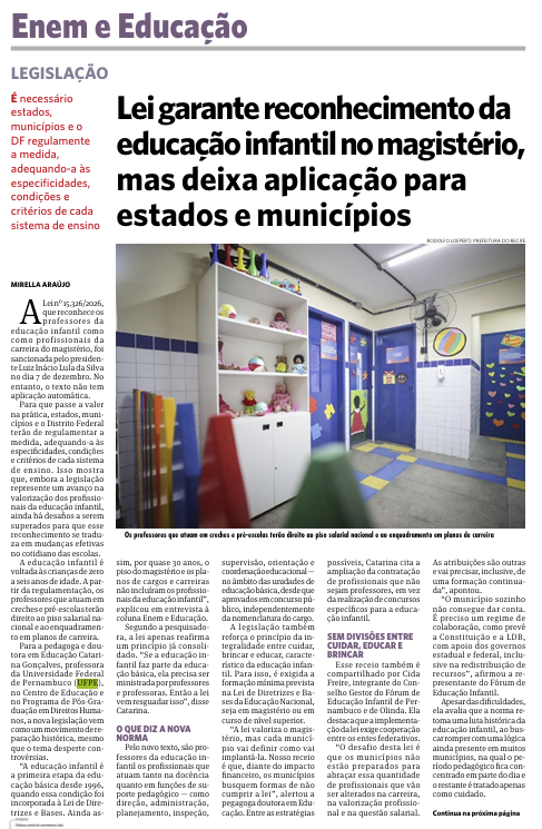“A educação infantil é a primeira etapa da educação básica desde 1996, quando essa condição foi incorporada à Lei de Diretrizes e Bases. Ainda assim, por quase 30 anos, o piso do magistério e os planos de cargos e carreiras não incluíram os profissionais da educação infantil”, explicou em entrevista à coluna Enem e Educação.