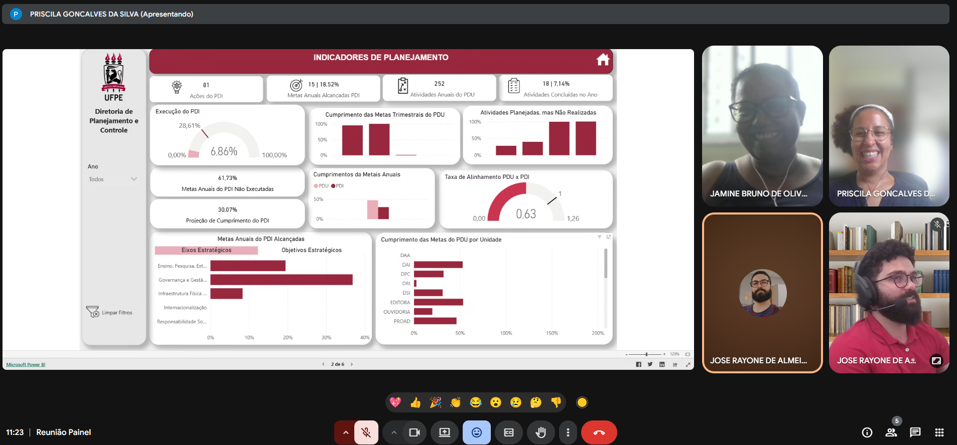 Durante as reuniões internas, a equipe da DPC vem realizando testes e aprimoramentos na estrutura do painel, buscando tornar o processo de monitoramento mais ágil, transparente e orientado a resultados. A ferramenta deverá servir como apoio estratégico à gestão universitária, contribuindo para a tomada de decisões e para o fortalecimento da cultura de planejamento na instituição.