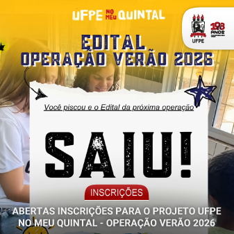 O projeto de extensão UFPE no Meu Quintal, coordenado pela Coordenadoria de Ensino de Ciências, Tecnologia e Inovação Extensionista (Cecine) e pelo Centro Acadêmico de Vitória (CAV), abre seleção para estudantes dos cursos de graduação e pós-graduação da UFPE participarem da Operação Verão 2026, a ser realizada no município de Serrita (PE). As inscrições começaram ontem (segunda, 29) e seguem até o dia 12 de outubro.