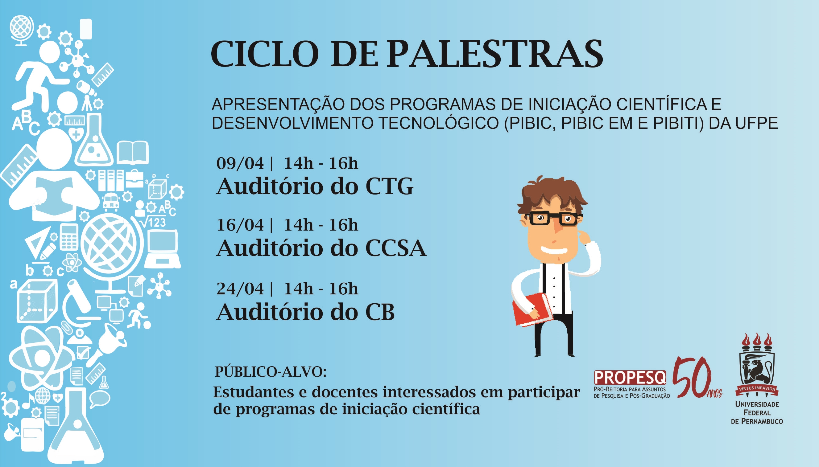 A Pró-Reitoria para Assuntos de Pesquisa e Pós-Graduação (Propesq), por meio do Setor de Bolsas de Iniciação Científica, vai realizar, neste mês, um ciclo de palestras gratuitas para apresentação dos programas de iniciação científica e desenvolvimento tecnológico da UFPE. Os encontros ocorrem nos dias 9, 16 e 24 de abril, nos auditórios do Centro de Tecnologia e Geociências (CTG), Centro de Ciências Sociais Aplicadas (CCSA) e Centro de Biociências (CB), respectivamente, no campus Recife, das 14h às 16h. Não é necessária a realização de inscrição para participar.