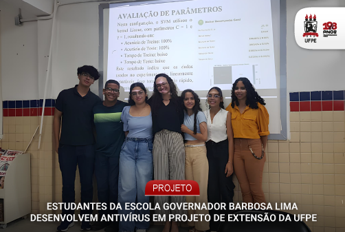 Ao longo de um ano, estudantes da Escola de Referência em Ensino Fundamental e Médio Governador Barbosa Lima, no Recife, dedicaram-se ao desafio de criar o próprio antivírus, do zero, para identificar um tipo de golpe digital chamado ransomware. A experiência ocorreu durante o curso “Inteligência Artificial aplicada à segurança da informação”, realizado em parceria com a Universidade Federal de Pernambuco (UFPE). O encerramento da formação foi realizado na última sexta-feira (28), com presença do professor Departamento de Engenharia Eletrônica e Sistemas da UFPE Sidney Lima, coordenador do projeto de extensão; e das engenheiras em formação Rachel Muniz e Carol Lira, que ministraram aulas ao longo do ano. Durante a cerimônia, houve uma apresentação da empresa Inorpel Security, especializada em cibersegurança.
