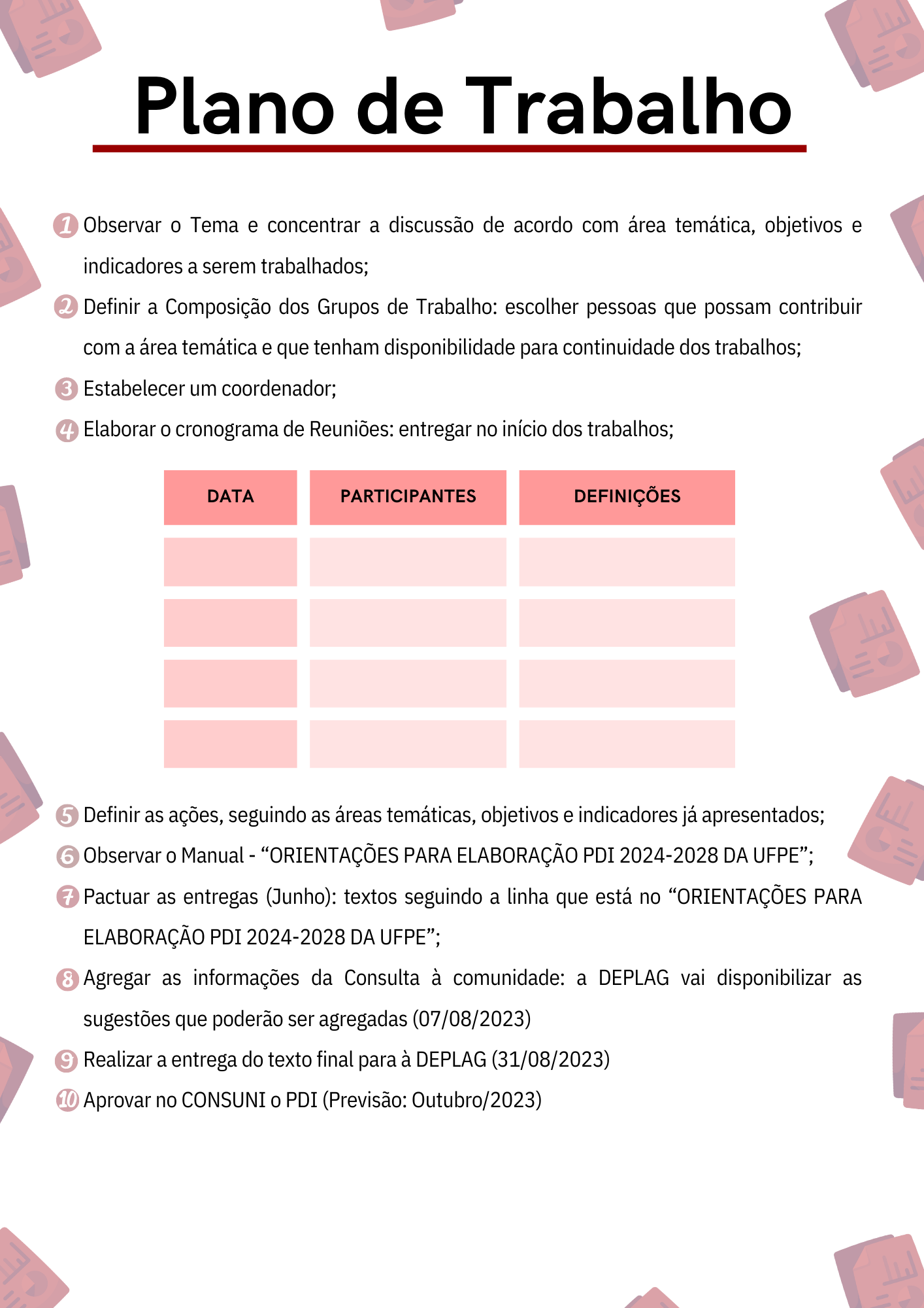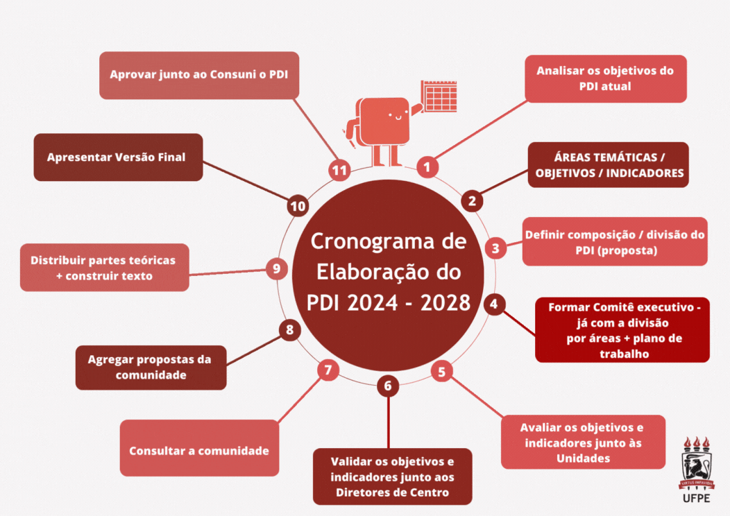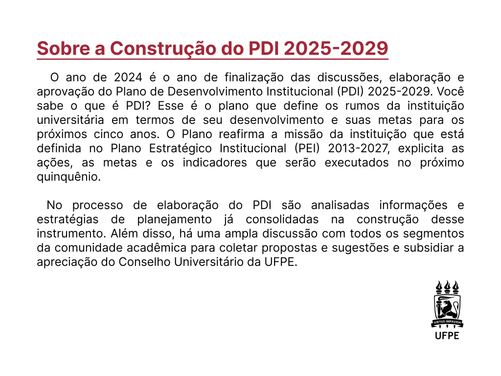 Sendo o PDI uma proposta de referência para o futuro da instituição, seu processo de elaboração foi pautado por ampla discussão com todos os segmentos da comunidade universitária para coletar propostas e sugestões e subsidiar a apreciação do Conselho Universitário da UFPE.