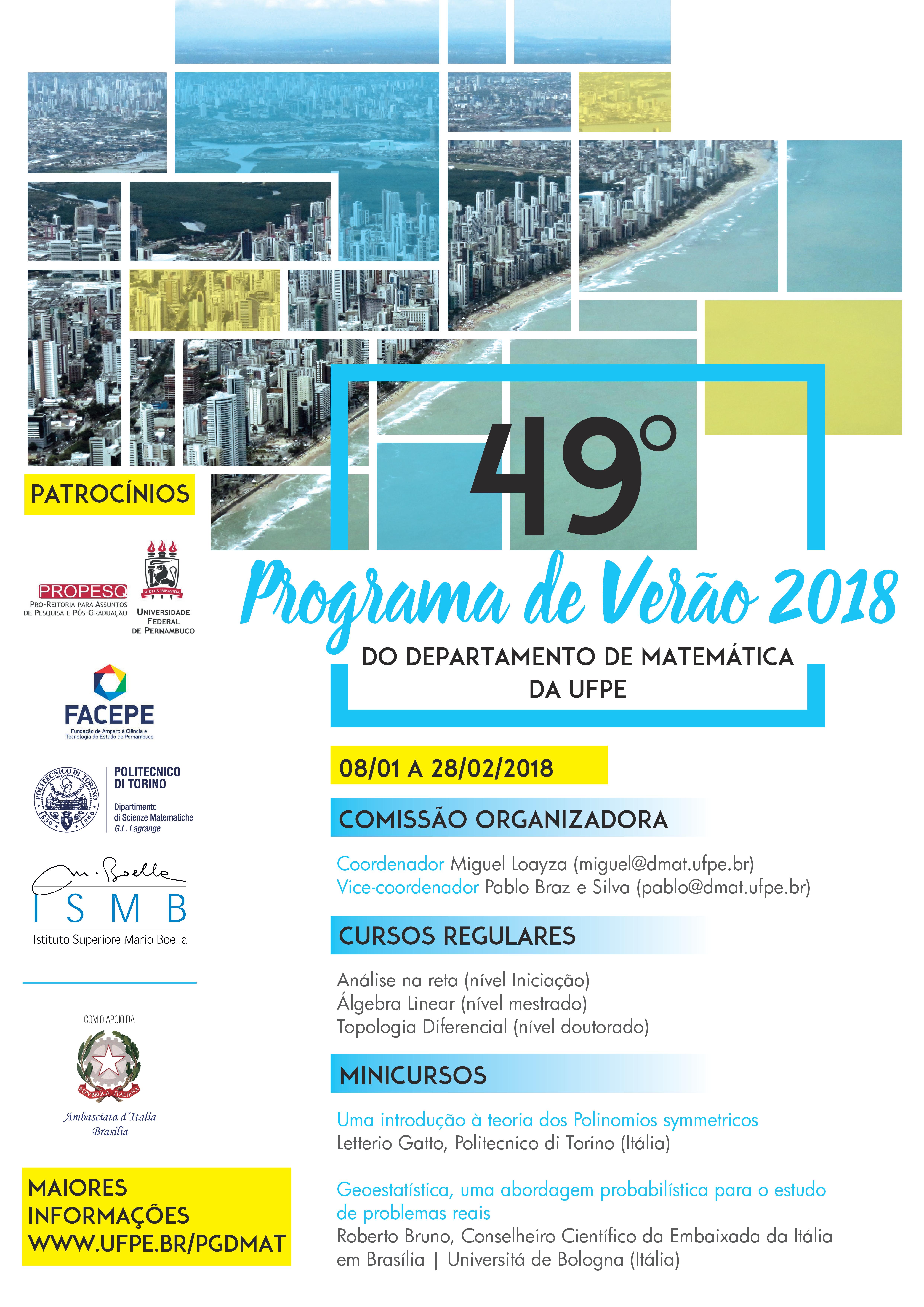 PROGRAMA – Nos meses de janeiro e fevereiro de cada ano, o DMat promove o Programa de Verão, evento que oferta disciplinas em nível de iniciação científica, mestrado e doutorado, além de minicursos, seminários e palestras. Em 2018 o programa incluiu em sua programação minicursos de capacitação para professores de matemática do ensino fundamental e médio. Todos os anos, o evento recebe alunos de diversos estados e conta com a participação de pesquisadores brasileiros e estrangeiros. Este ano, para a realização do evento, o Departamento de Matemática contou com o apoio da Propesq-UFPE, Facepe, Politécnico de Turim, Instituto Superiore Mario Boella e da Embaixada Italiana no Brasil.