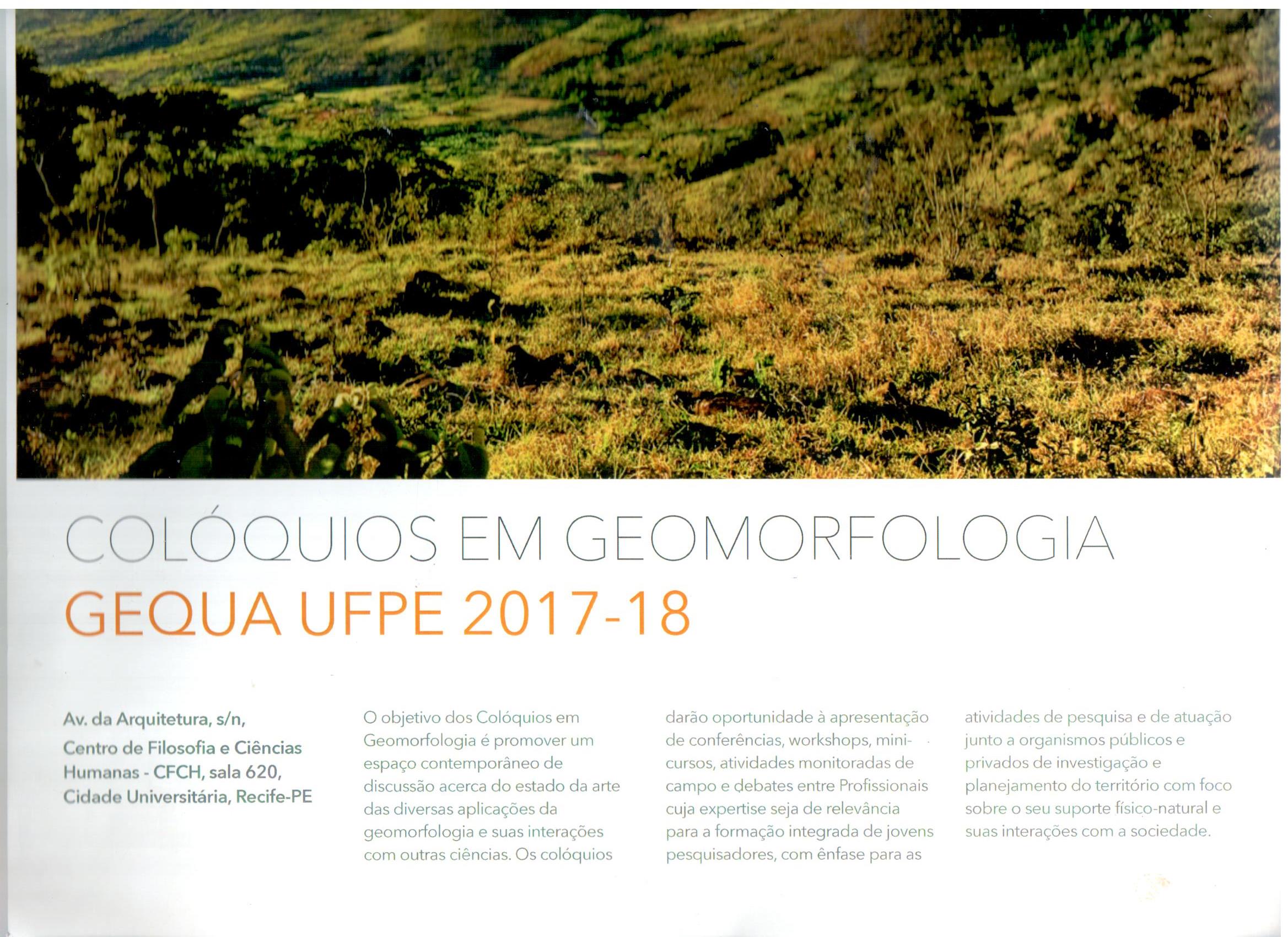 - Workshop Estilos Fluviais. Geomorfologia na recuperação e conservação de ambientes fluviais. Realização: Grupo de Estudos do Quaternário do Nordeste Brasileiro (GEQUA). Período: 22/09/2017. Divulgação: cartaz. Inscrições: labgequaufpe@gmail.com
