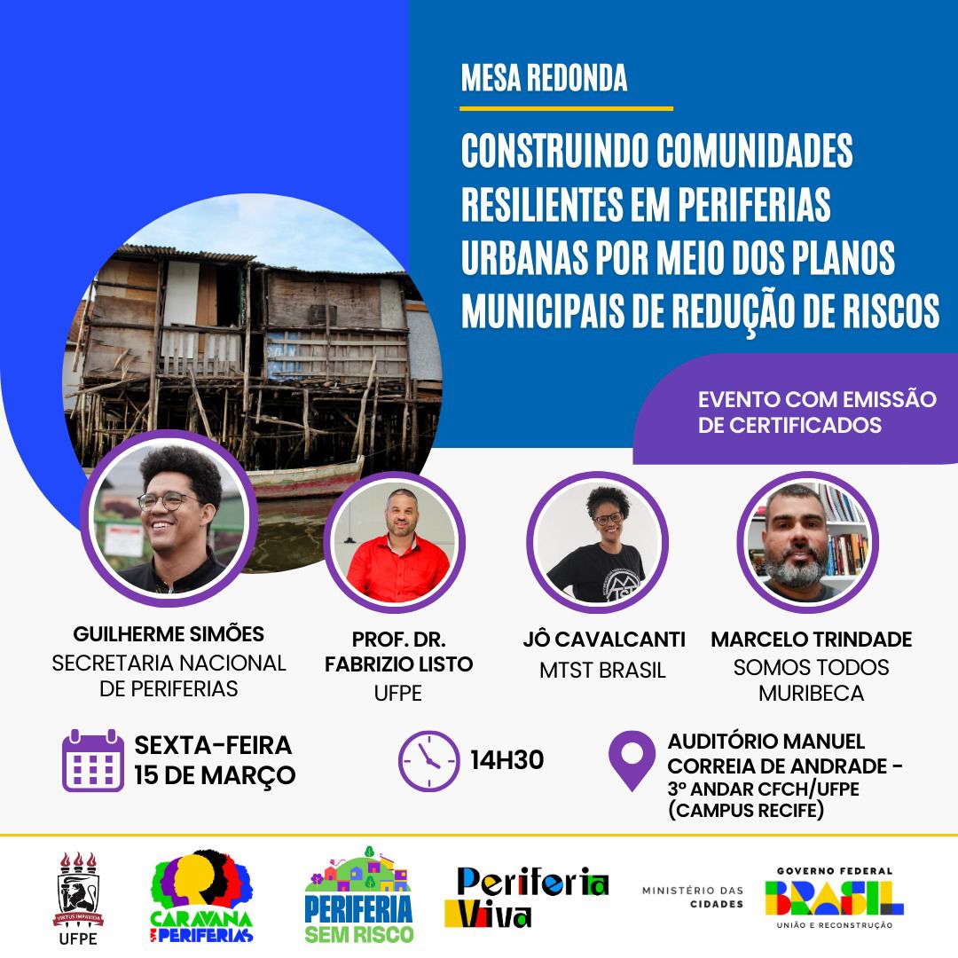 - Mesa Redonda – Construindo Comunidades Resilientes em Periferias Urbanas por Meio dos Planos Municipais de Redução de Riscos. Período: 15 de março. Hora: 14h30m. Local: Auditório Manuel Correia de Andrade – 3º Andar CFCH/UFPE – Campus Recife. Cartaz.