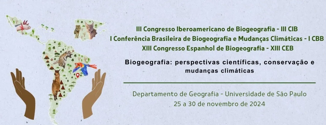 - III Congresso Iberoamericano de Biogeografia – III CIB. Período: 25 a 30 de novembro. Local: Universidade de São Paulo – USP.Tema geral: “Biogeografia: perspectivas científicas, conservação e mudanças climáticas”. Cartaz. Portal do evento: https://www.even3.com.br/biogeografia-icbb-iiicib-xiiiceb/