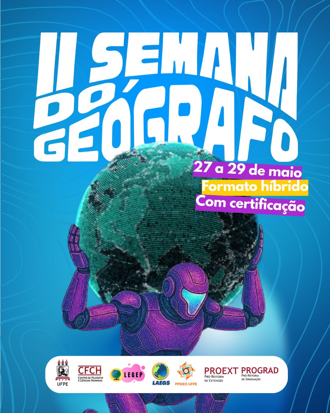 - II SEMANA DO GEÓGRAFO: Formação da Identidade Geógrafa na Sociedade 4.0. Período: 27 a 29 de maio de 2025. Local: Centro de Filosofia e Ciências Humanas (CFCH) da Universidade Federal de Pernambuco (UFPE) Campus Recife-PE. Cartaz. Acesse a circular.